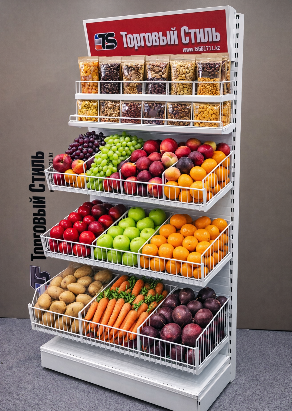 Металлические стеллаж в Усть-Каменогорске. Стеллажи торговые металлические, для магазинов и минимаркетов в Усть-Каменогорске. Полки пристенные и островные стеллажи, хлебные и овощные стеллажи, стеллажи с перфорацией для крючков и полочные стеллажи Нордика.